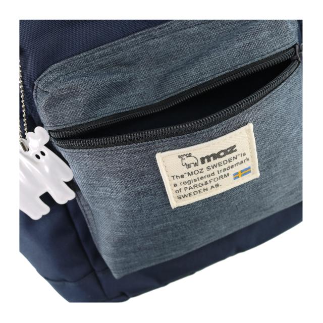 本体生地に、2種類のポリエステル生地を使用したシリーズ。ZZEI-04は、小さめのスクエア型リュック。内部には携帯ポケットやメッシュ生地で中身の見やすい多機能ポケットを完備。伸縮性のある素材を使用したmozオリジナルのmozpocketも完備。本体背面には、左右にファスナーが付いており、本体内部へアクセス出来るファスナーと、背面の収納スペースにアクセス出来るファスナーが付いています。Mozのアイコンであるヘラジカのリフレクトチャーム付き。