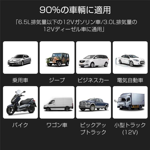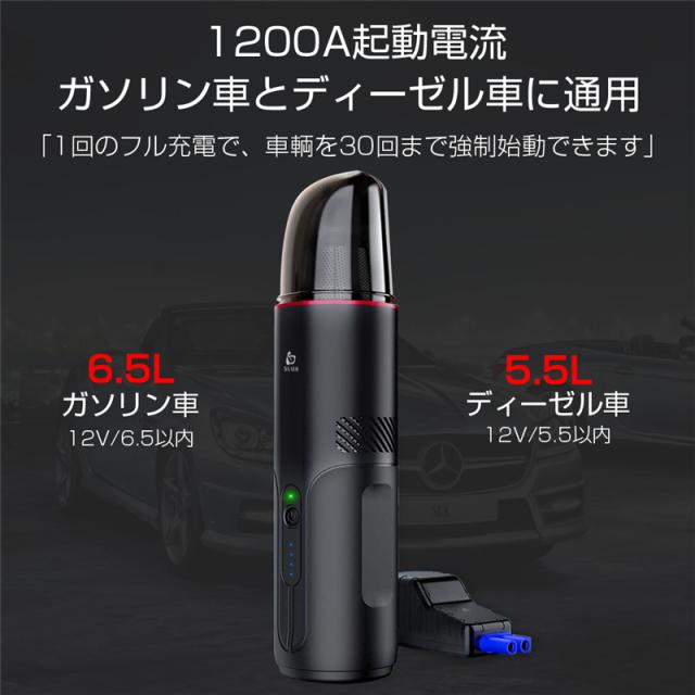 【12V車用ジャンプスターター】12V小型ポータブルジャンプスターターはピーク電流が1200Aに達して、6.5Lまでのガソリン車/5.5Lまでのディーゼル車に利用できます。