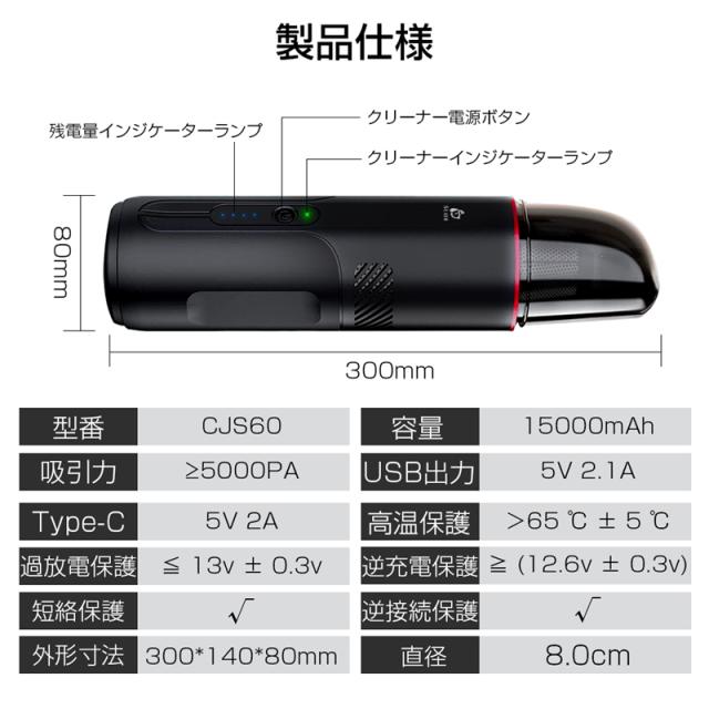 【パッケージ内容】製品本体、Type-Cケーブル、EC5シガライターアダプター、隙間ツール、ブラシ、日本語取扱説明書