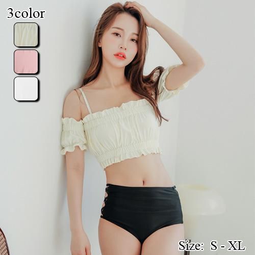 【グラシア】 水着 ハイウエスト レディース ビーチウェア スイムウェア 流行 海 プール ビキニ オフショル ギャザー クロス サイドクロス パフスリーブ クリーム×ブラック ピンク×カーキ ホワイト×グレー S M L ×L