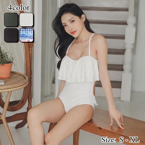 ボリュームのある胸元フリルとウエストカットでボディラインを美しく見せる技ありのモノキニデザイン。