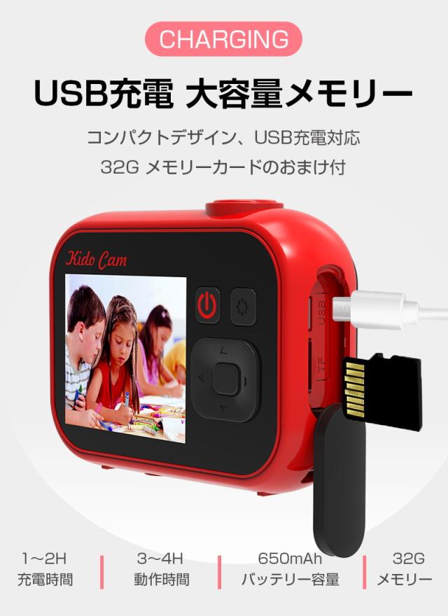 【パッケージ内容】子供カメラ本体、USBケーブル、32GBメモリカード、ストラップ、日本語取扱説明書