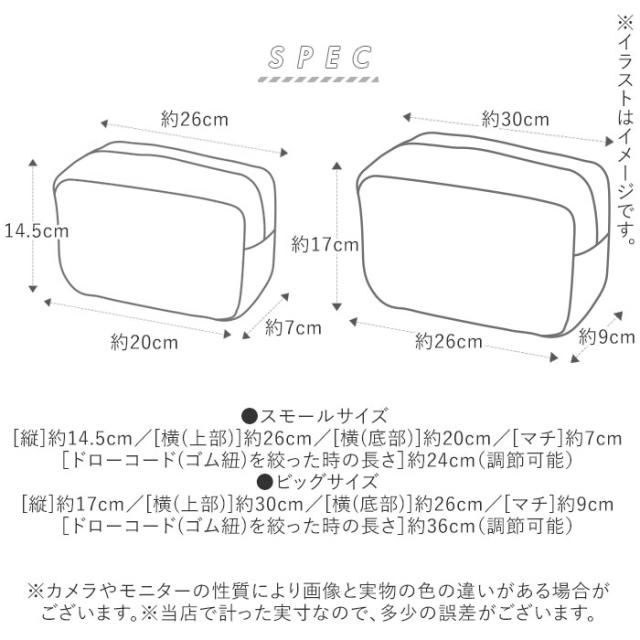 | サイズ | ・スモールサイズ [縦]約14.5cm/[横(上部)]約26cm/[横(底部)]約20cm/[マチ]約7cm [ドローコード(ゴム紐)を絞った時の長さ]約24cm(調節可能) ・ビッグサイズ [縦]約17cm/[横(上部)]約30cm/[横(底部)]約26cm/[マチ]約9cm [ドローコード(ゴム紐)を絞った時の長さ]約36cm(調節可能) ※サイズは当店平置き実寸サイズです。実際の商品とは多少の誤差が生じる場合がございます。あらかじめご了承ください。 |