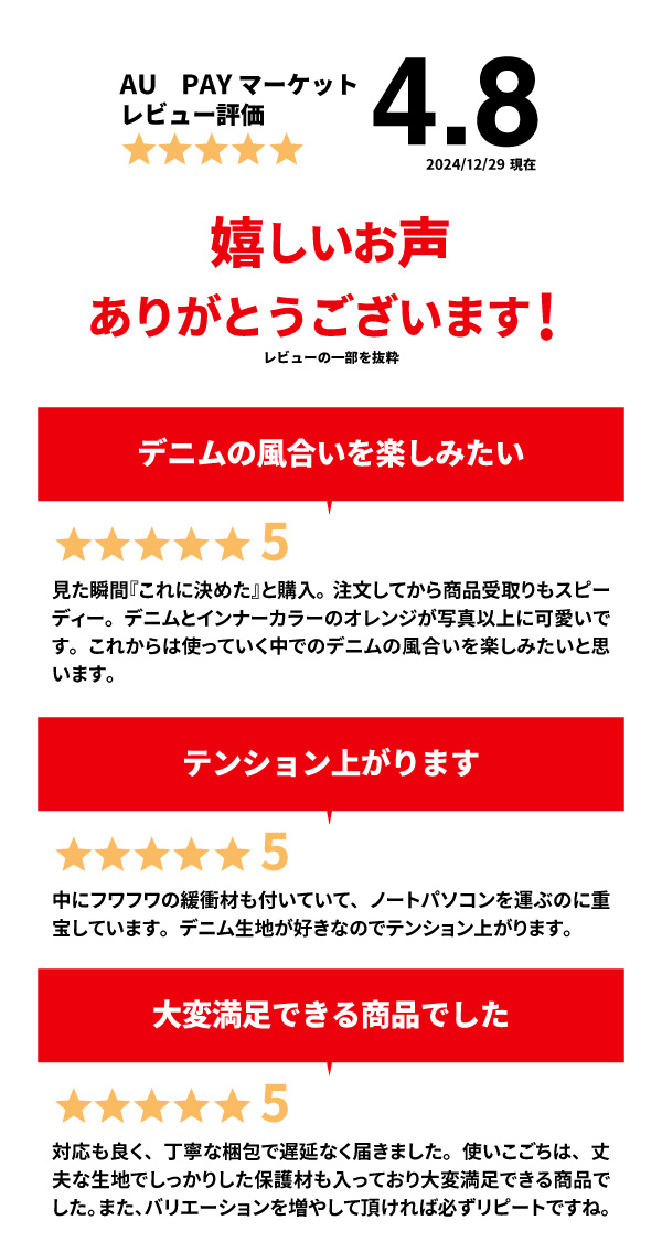 - 見た瞬間『これに決めた』と購入。 注文してから商品受取りもスピーディー。 デニムとインナーカラーのオレンジが写真以上に可愛いです。 これからは使っていく中でのデニムの風合いを楽しみたいと思います。