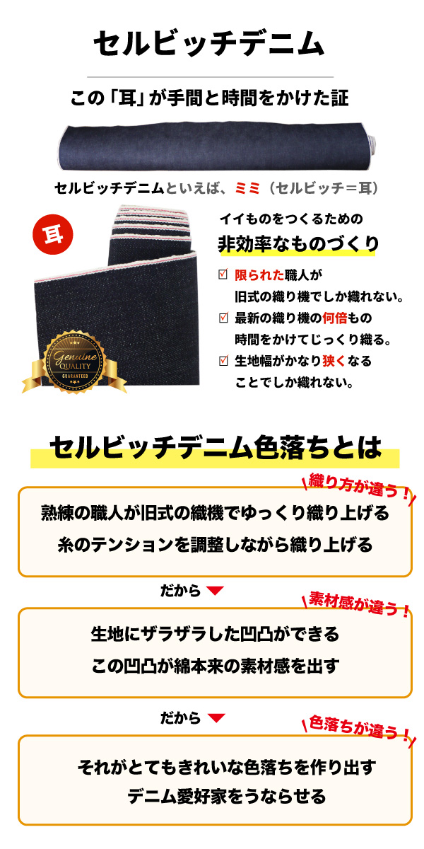 昔ながらの製法を受け継ぎ、手間を惜しまず「本来の技術」にこだわることで、使い込むほどに風合いが増し、味わい深いデニム生地に仕上がります。そのような三備産地の伝統技術を継承し、瀬戸内エリアに息づく職人技が融合した高品質なデニム生地を使用して、商品の製造は中国の提携工場で行なっております。