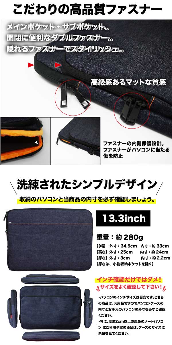 ★13.3インチ 外寸:約34.5x25x3cm 内寸:約33x24x2.2cm 重量:約280g