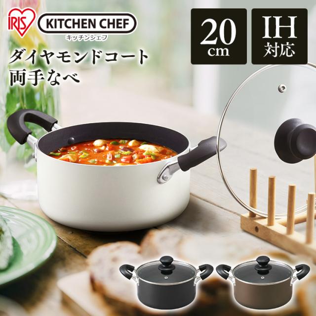 鍋 両手鍋 ih ダイヤモンドコート 両手なべ20cm DIS-P20 ホワイト ブラック ブラウン 全3色 両手鍋 ダイヤモンドコート 両手なべ20cm KITCHENCHEF ダイヤモンドコート 鍋 なべ nabe ナベ キッチンシェフ IH ガス アイリスオーヤマ