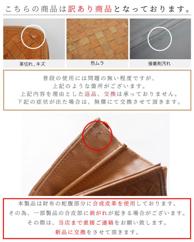 | 商品詳細 | オーストリッチ本革を贅沢に編み込み込んで、カジュアルに仕上げました。 定番のL字タイプのファスナーはスリムでかつ軽量!男女問わず人気の形になります。 使い込む程に"艶"と"味"が増していくので、使うほどに愛着が湧き、経年変化をお愉しみ頂けます。 【訳あり商品】 普段の使用には問題の無い程度ですが、ページ記載のような箇所がございます。 記載内容を理由とした返品、交換は承っておりませんので恐れ入りますが、予めご了承の上、ご注文をお願い致します。 |