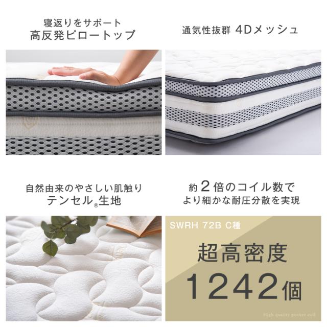 高反発ピロートップ テンセル ポケットコイル シングル 25cm 超高密度コイル 通気性抜群 4Dメッシュ 抗菌 調湿 ポケットコイルマットレス ベッドマット コイルマットレス 圧縮【商品番号:1780016100】