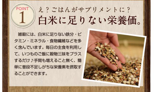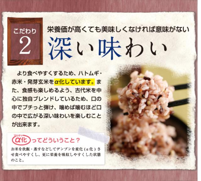 発芽玄米:通常の玄米より消化吸収が良く、ミネラルが効率よく吸収されます。