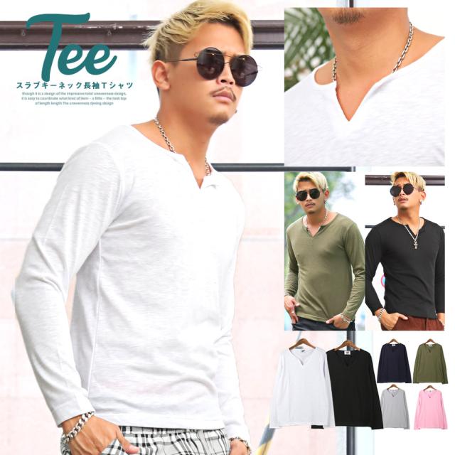 秋新作 ロンT メンズ キーネック 長袖 Tシャツ トップス 長袖Tシャツ スラブ 天竺 無地 トップス インナー シンプル キレイめ aa-0024