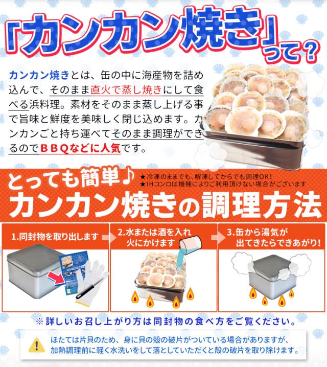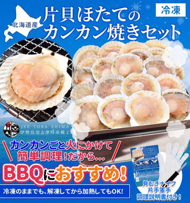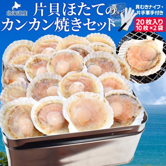 ほたて カンカン焼きセット 20枚入 冷凍ほたて 送料無料 北海道産 半缶入り(貝むきナイフ・片手用軍手付き) ほたて片貝 海鮮 バーベキューセット 寒中見舞い ギフト