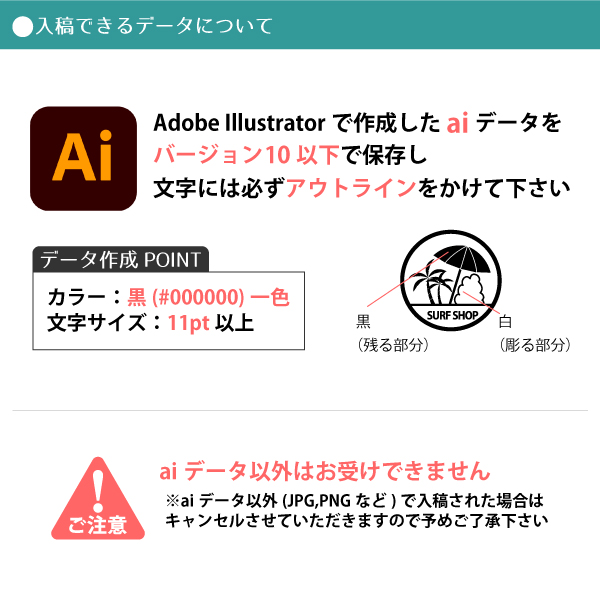 | ■入稿データは【aiデータ】のみとなります。 他データ(jpg / png等)で入稿の場合はキャンセルとなります。 ■「ロゴ入れ有料オプション」のみのご利用はできません。ロゴ入れ対応商品と一緒にご購入ください。 ■ロゴによっては製作できない場合がありますので、購入前にご相談ください。 ■「ロゴ入れ有料オプション」は1商品につき1つのみのオプションです。複数のロゴ確認をご希望の場合は、必要な分の「ロゴ入れ有料オプション」をご購入ください。 ■デザインをお客様にご確認頂いてからの作成となりますので、通常のご注文よりもお時間を頂いております。 そのため、即日出荷は出来かねますので、お急ぎのお客様はご注意ください。 ■「ロゴ入れ有料オプション」はあくまでも書体確認のサービスですので、細かいご注文に対応出来ない場合がございます。また、彫刻の関係上、出来上がりイメージに若干の差異が生じる場合がございます。 ■「ロゴ入れ有料オプション」は、サービスの性質上「ご注文のキャンセル」「返品」等は出来ません。 ■ロゴによっては住所印からアクリルへ変更していただく場合もございます。 |