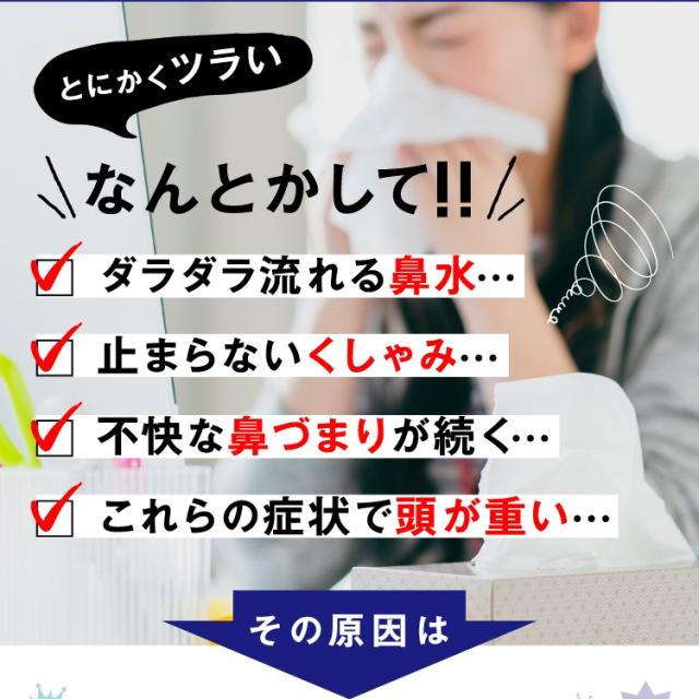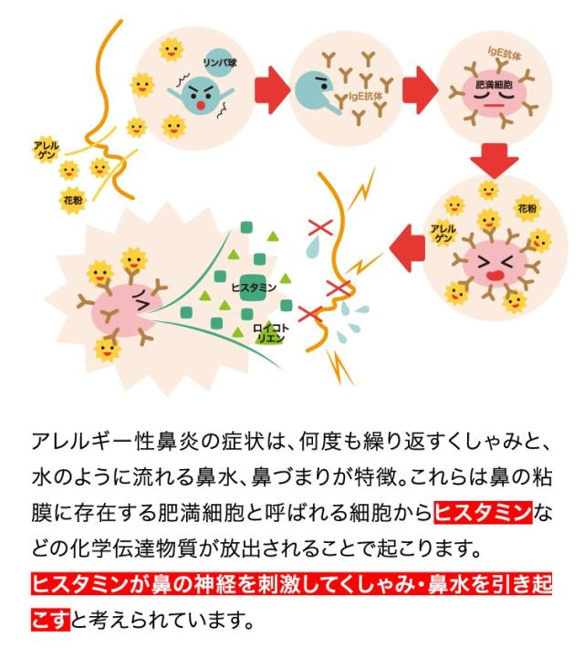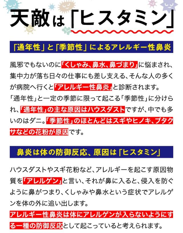 鼻炎の元となるヒスタミンを抑え、鼻のアレルギー症状による鼻みず、鼻づまり、くしゃみなどのつらい症状を緩和します。