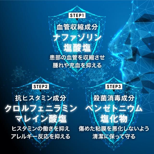 3つの有効成分「ナファゾリン塩酸塩」「クロルフェニラミンマレイン酸塩」「ベンゼトニウム塩化物」を配合したアレルギー性鼻炎用薬。