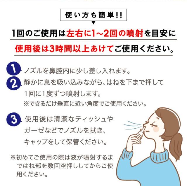 ■用法・用量:成人(15歳以上)及び7歳以上の小児:1回に1〜2度ずつ、1日1〜5回、鼻腔内に噴霧してください。なお、適用感覚は3時間以上おいてください。