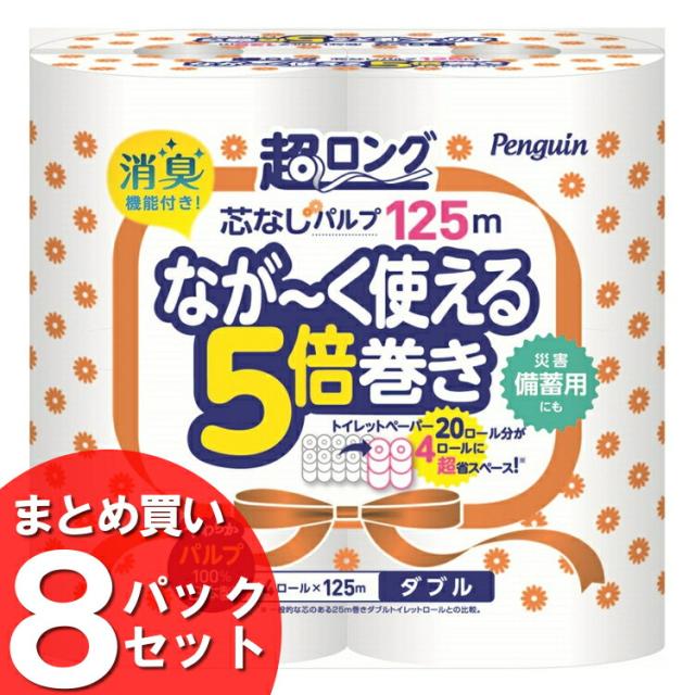 【8個セット】トイレットペーパー ダブル まとめ買い 芯なし ペンギン芯なし超ロング(パルプ)125m4Rダブル 2606 白 長持ち まとめ買い 防災 備蓄 2枚重ね 丸富製紙 【D】送料無料