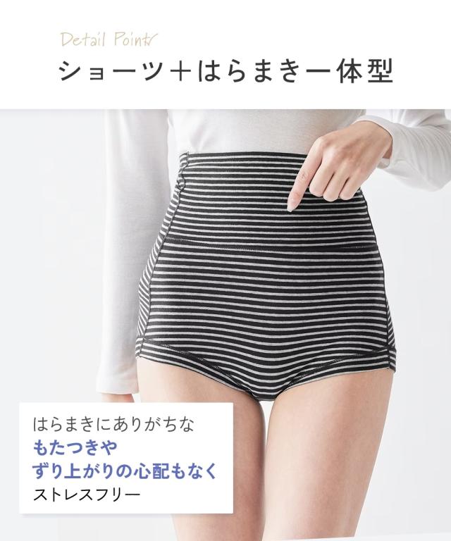 冷え対策に最適な、腹巻付のショーツです。ウエストは折り返し仕様でらくちん!前脚口はゴムなし&後ろ脚口はゴムが直接肌にあたらない仕様で快適。身生地は綿混ストレッチ素材でやさしいはき心地です。
