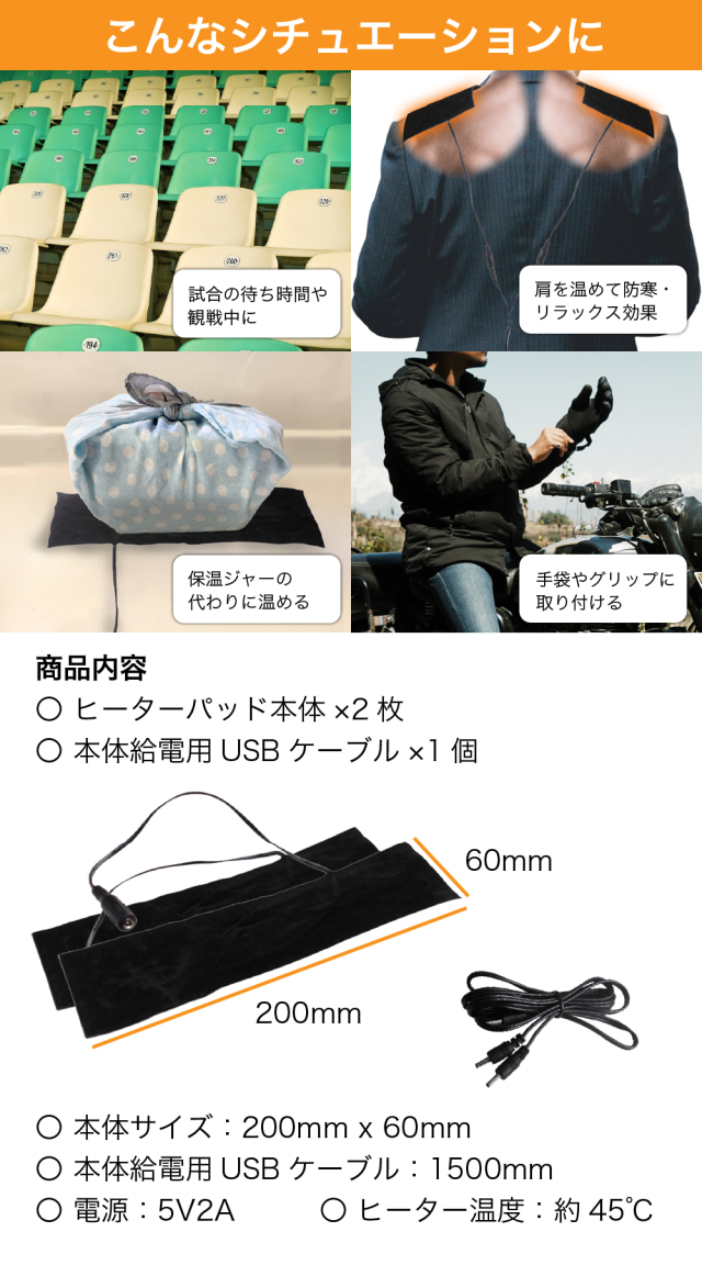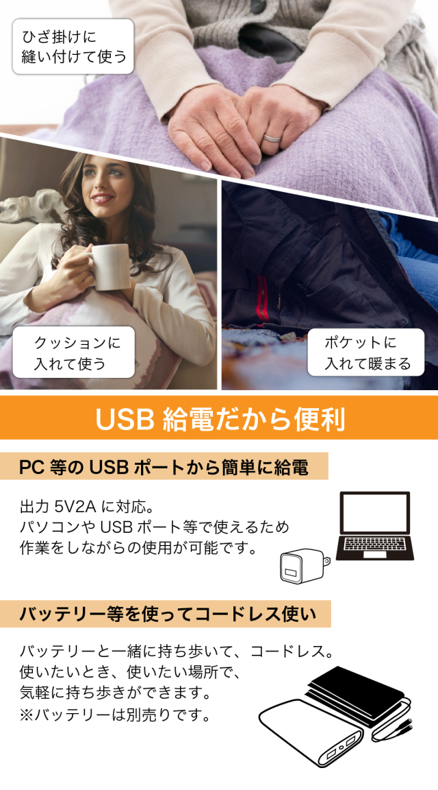 - 色々な用途で利用可能なので、満足。ブランケットで、手を温めてます。モバイルバッテリーで、移動時も使ってみようと思っています。