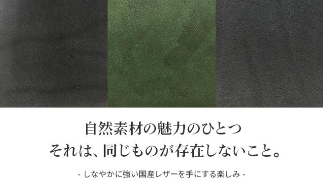 手袋に使用するとても上質で柔らかい国産原皮を使用し、兵庫県姫路市のタンナーでナメし染色を行っています。そこからさらにクロムナメし、タンニンを加える事で吟面を締め。型崩れや耐久力をアップさせています。また、最終工程としてバキューム加工を施し独特のツヤとしっとり感を出したオリジナルレザーを使用したシリーズです。
