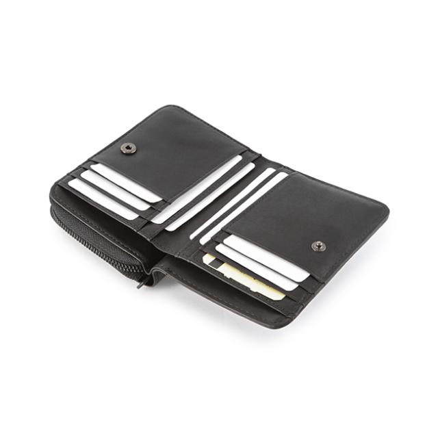 ファスナー開閉によるボックス型の小銭入れで大きく開き視認性も良好。