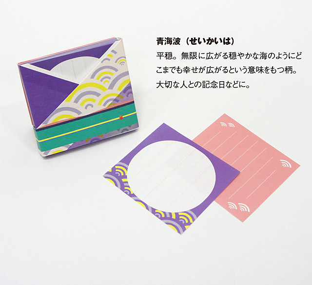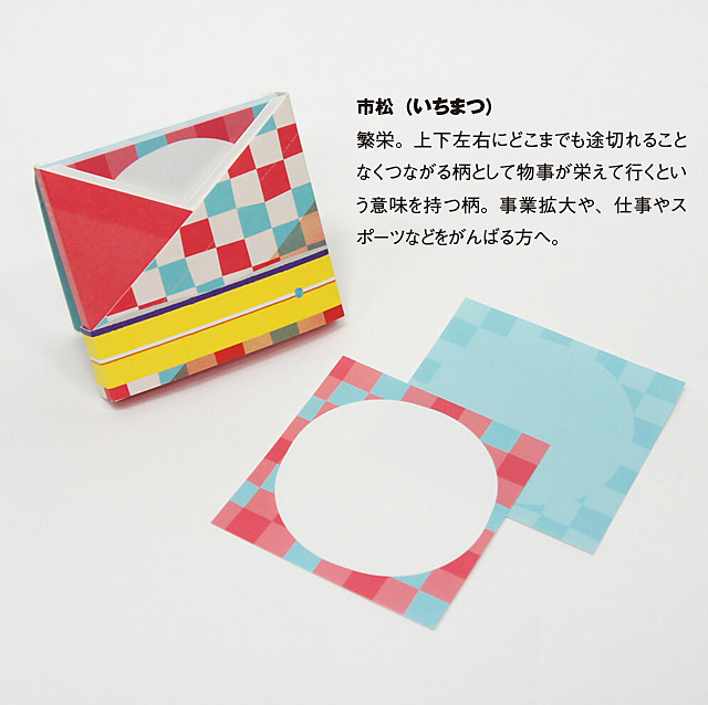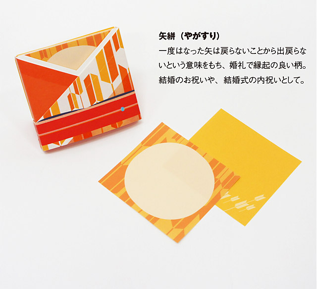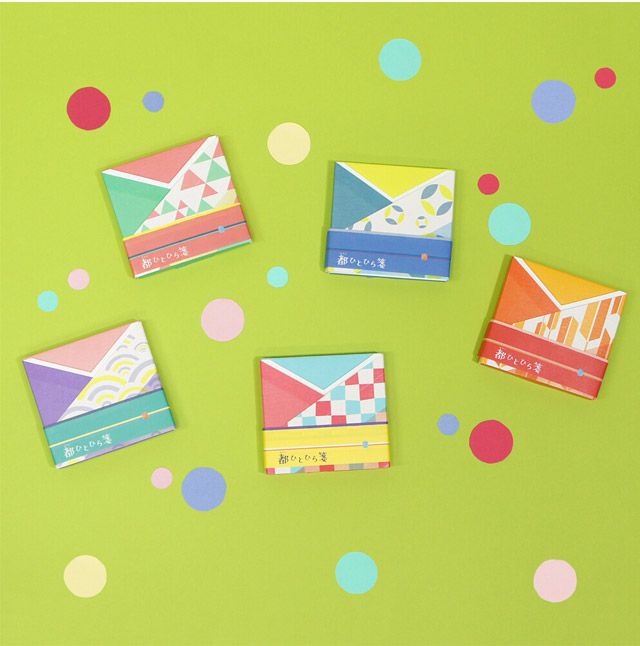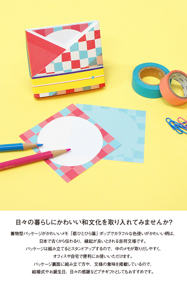 着物型パッケージがかわいいメモ「都ひとひら箋」 ポップでカラフルな色使いがかわいい柄は 日本で古くから伝わるり、縁起が良いとされる吉祥文様です。 パッケージは組み立てるとスタンドアップするので、中のメモが取りだしやすく、 オフィスや自宅で便利にお使いいただけます。 パッケージ裏面に組み立て方や、文様の意味を掲載しているので、 結婚式やお誕生日、日々の感謝などプチギフトとしてもおすすめです。