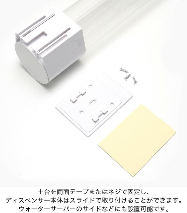 土台を両面テープまたはネジで固定し、ディスペンサー本体はスライドで取り付けられます。