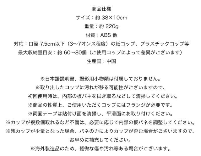 - 紙コップがスッキリ収納できるのでよかったです。 たまに一つではなく3つ4つ一緒に落ちてくるのが難ですが、それなりなので仕方ないです。