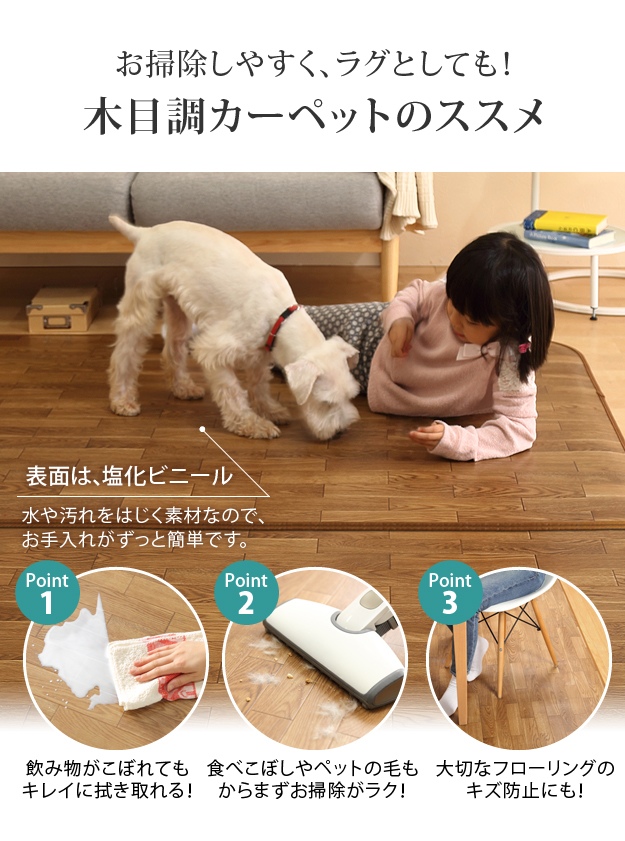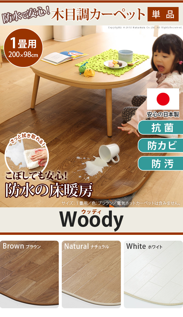 【日本製/防水・抗菌・防カビ・防汚/床暖対応】木目調カーペット Woody(ウッディ) 200x98cm 1畳用 3色対応 61600001 ホットカーペットカバー ラグ ラグマット オールシーズン