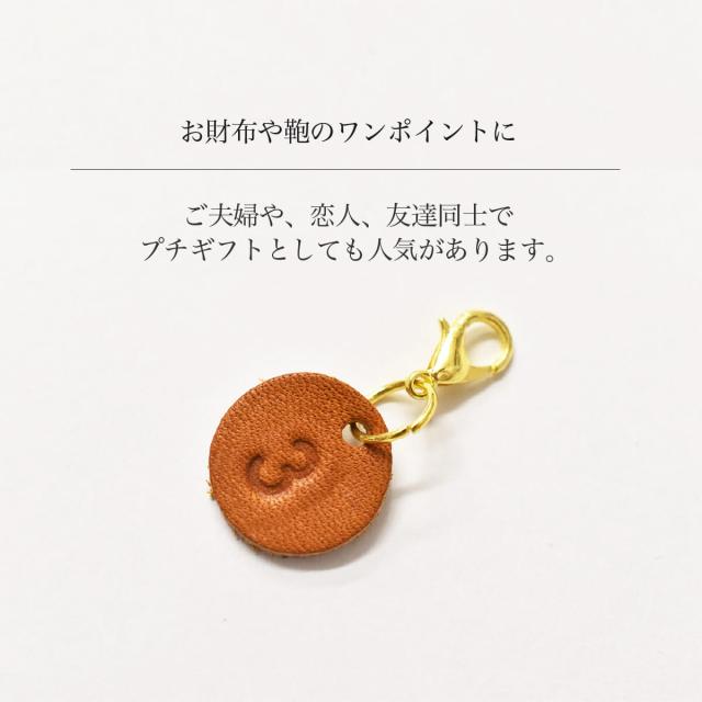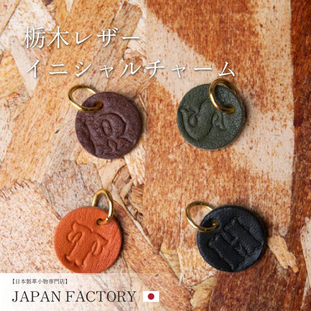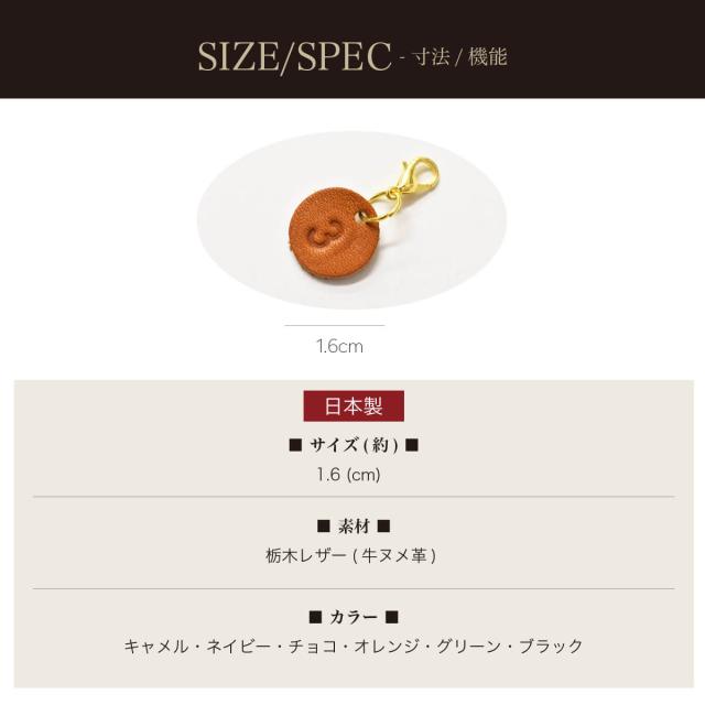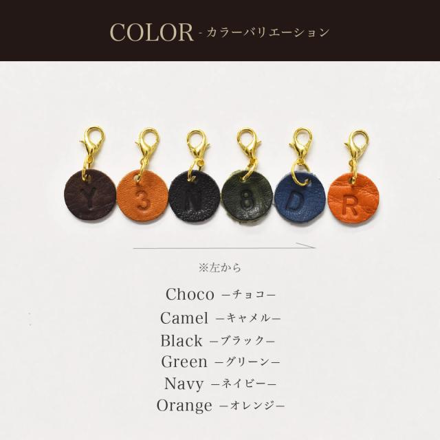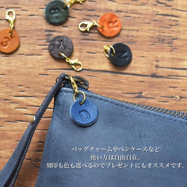 [栃木レザー イニシャルチャーム]お財布や鞄のワンポイントに。ご夫婦や恋人、友達同士でプチギフトとしても人気があります。バッグチャームやペンケースなど、使い方は自由自在。刻印も色も選べるのでプレゼントにもオススメです。天然皮革のありのままを、ふんだんに使用。「同じ表情は一つとしてない。唯一無二の、革の表情を楽しんでいただきたい。」そんな想いから、革の豊かな部分も避けることなく、ふんだんに使用しています。1点1点の違いもお楽しみください。【カラー】Choco / Camel / Black / Green / Navy / Orange