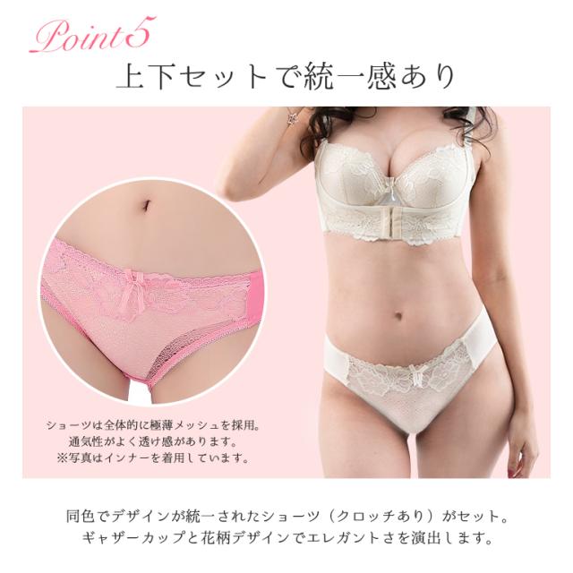 同色・デザインのショーツセット(クロッチあり)!ギャザーカップと花柄デザインでエレガントさを演出。