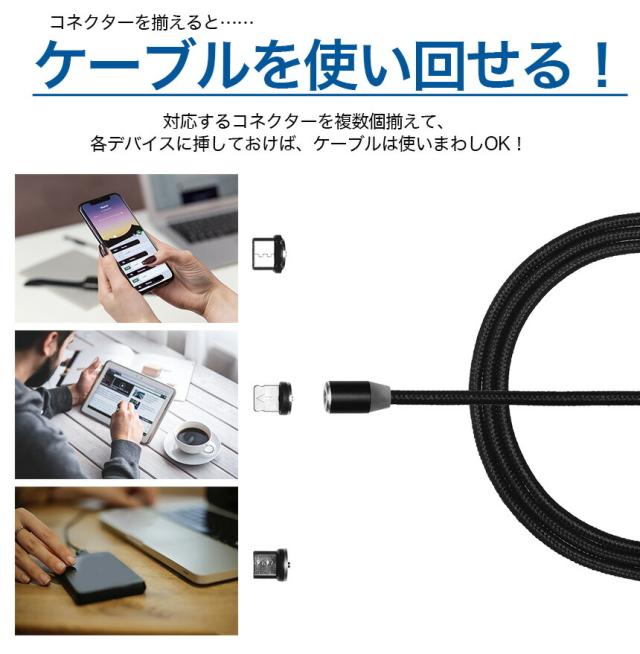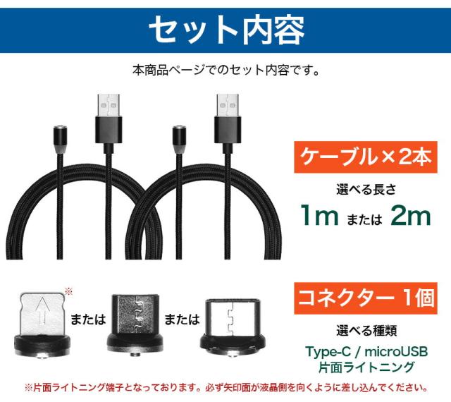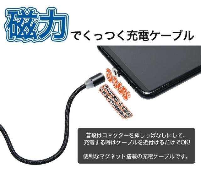 【3点セット】スマホ 充電ケーブル マグネット 磁石 Type-C microUSB 片面ライトニング 急速 1m 2m LED 光る Android タイプC アンドロイド スマートフォン
