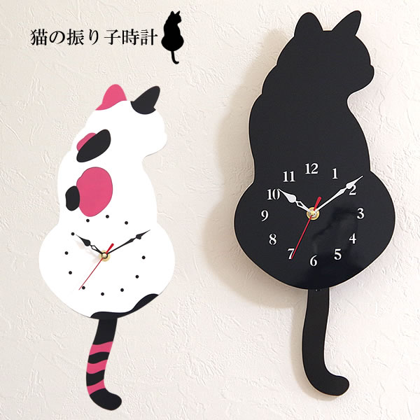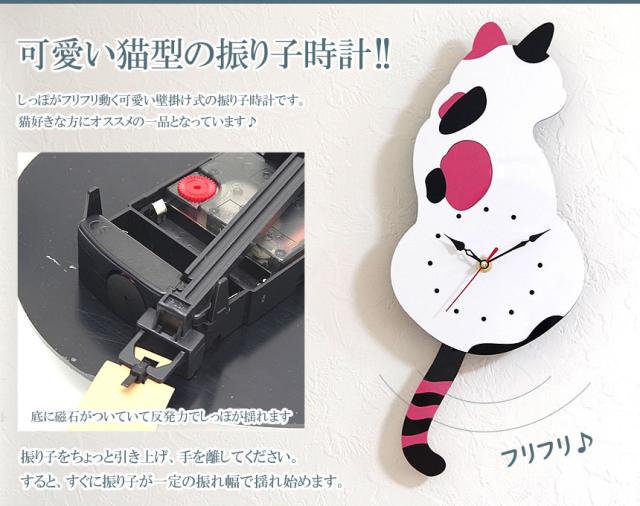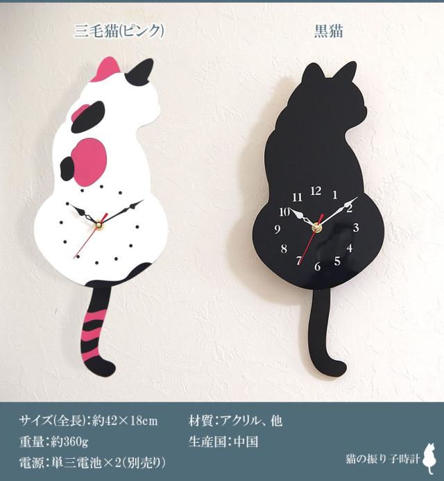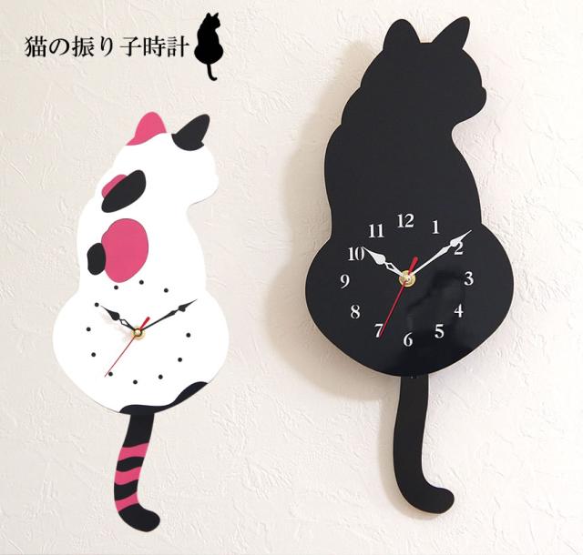 壁掛け 振り子 時計 猫 ネコ 可愛い ゆらゆら 穴あけ必要 アナログ時計 インテリア オシャレ 黒猫 三毛猫