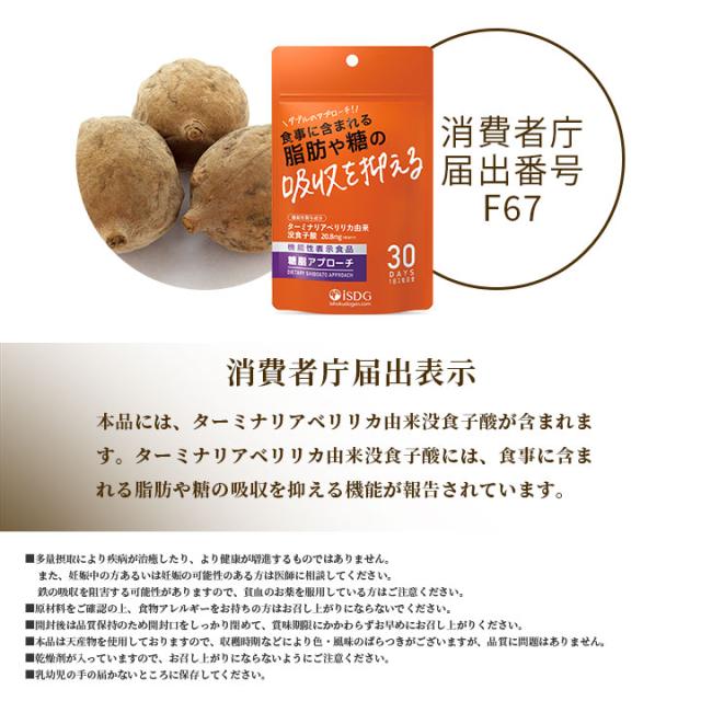 | 届出表示 | 本品には、ターミナリアベリリカ由来没食子酸が含まれます。ターミナリアベリリカ由来没食子酸には、食事に含まれる脂肪や糖の吸収を抑える機能が報告されています。 |