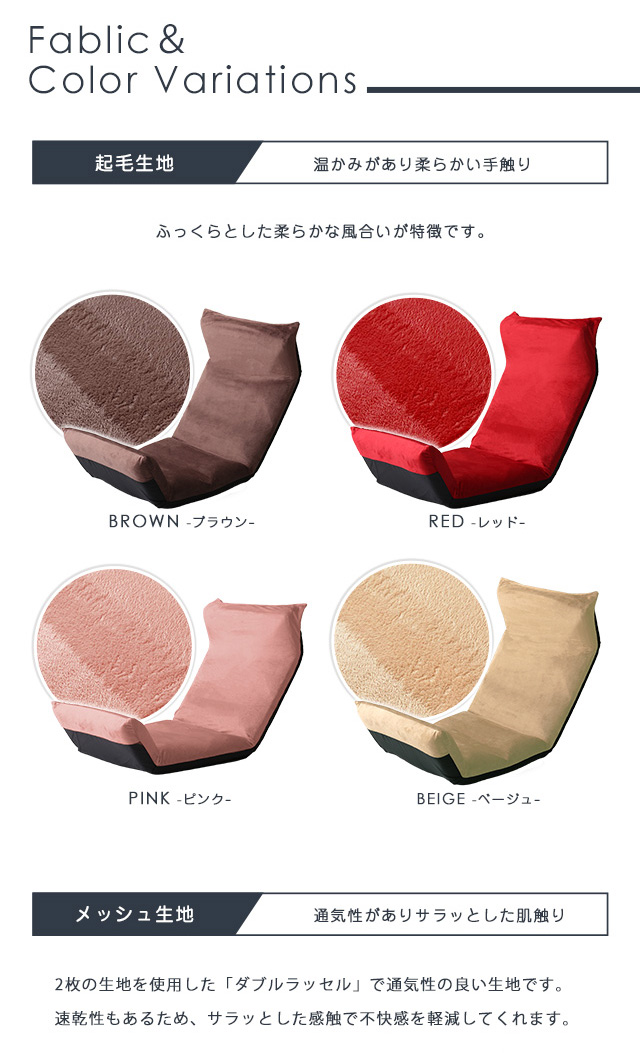 メッシュ生地:ダークブラウン (DBR)、レッド(RD)、ブルー(BL) 起毛生地:ベージュ(KBE)、ブラウン(KBR)、レッド(KRD)、ピンク(KPK)