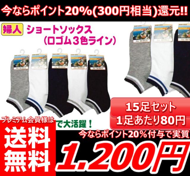 即発送【今なら必ずポイント20%(300円分)還元!!】【(15足セット)女性用 口ゴム3色ライン靴下】 女性 婦人 ショートソックス ソックス 靴下 15足セット