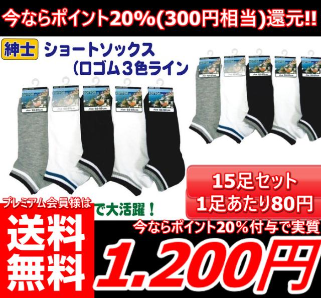 即発送【今なら必ずポイント20%(300円分)還元!!】【(15足セット)紳士 口ゴム3色ライン靴下】 紳士 ショートソックス ソックス 靴下 15足セット