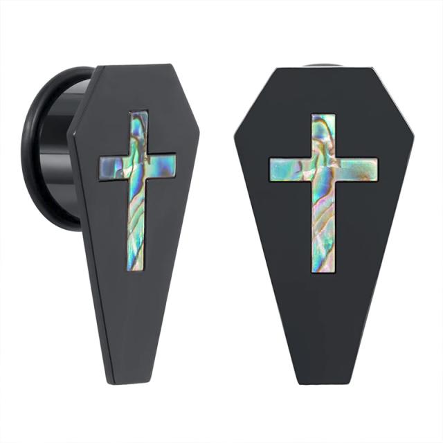 黒色ブラックのアクリル樹脂製のプラグにバンパイアの棺桶をモチーフにしたデザインに貝殻シェルで十字架クロスをデザインしたボディピアス。