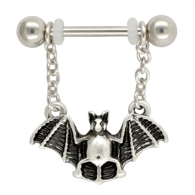 コウモリのボディピアスはハロウインのドラキュラの仮装のアイテムにも使えそう。男性からも女性からも人気のモチーフはメンズでもレディースでも使えるのでペアルックやプレゼントにもおすすめです。乳首用としてだけでなく、耳や軟骨にも!