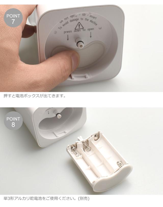 ■商品特性1 【乾電池について】 1.バッテリーコンパートメントの下部を押すと乾電池ボックスが出てきます。 2.ボックスに乾電池をプラス極とマイナス極を表示に合わせてはめ込み、ボックスごと本体に戻し、カチッという音が鳴るまで入れたら取り付け完了です。 ・乾電池は種類の違うものや古い電池を混ぜて使用せず、充電式電池ではないアルカリ電池をお使いください。 ■商品特性2 【スイッチについて】 ・手をかざしても泡が出てこない場合は、もう一方の手をかざしてみる、または機械の上部が濡れていないかなどをご確認いただいた上で再度お試しください。 ■商品特性3 【液体の交換について】 1.下のボトルを持ち、時計回りに回して取り外します。 2.キャップを反時計回りに回して取り外すことで交換が可能です。 ■商品特性4 機械が損傷する可能性がございますので、傾けたり、倒したりすることはお控えください。 ■商品特性5 生産試験の都合上、開封した商品に水滴が残っている場合がございますが、正常にご利用いただけます。 ■商品特性6 容器にロゴが入っている商品と入っていないものが混在しております。ロゴの有無についてはお選び頂く事はできませんのであらかじめご了承下さい。 |