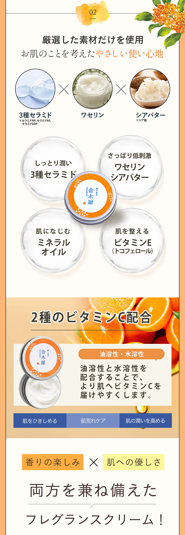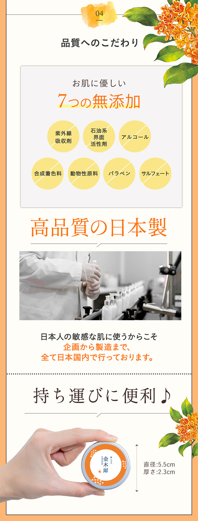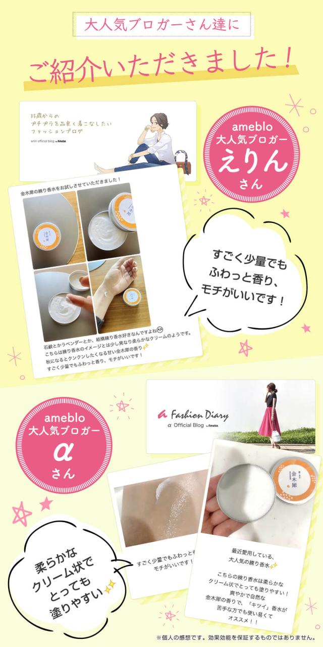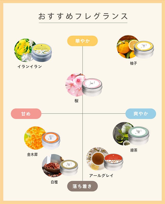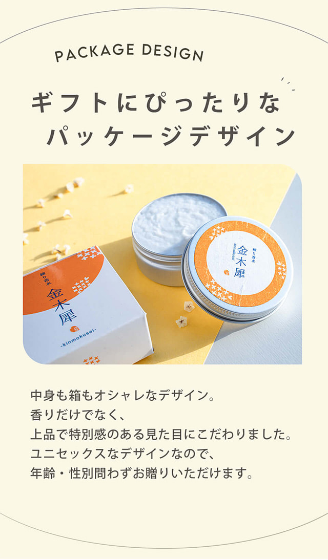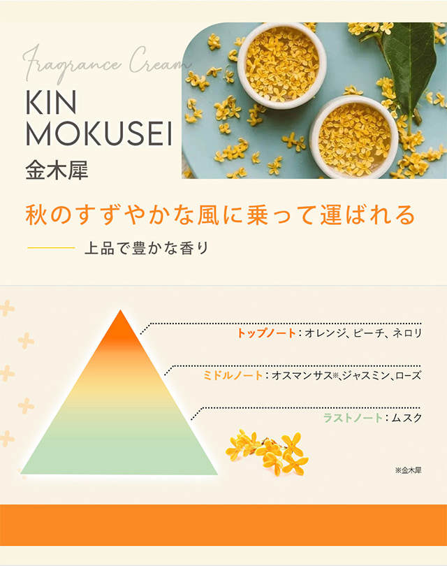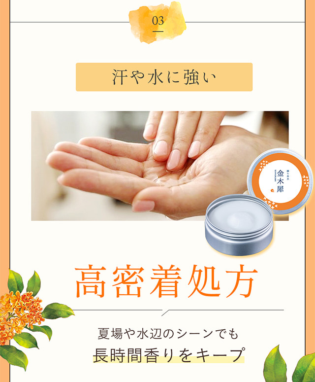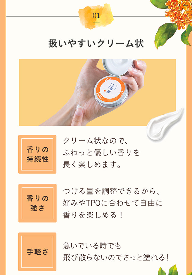 | 商品特徴 | ほのかに香る「金木犀」の香り。 爽やかで、自然な香りなので「キツイ」香水が苦手な方でも使い易いフレーバーです。 |