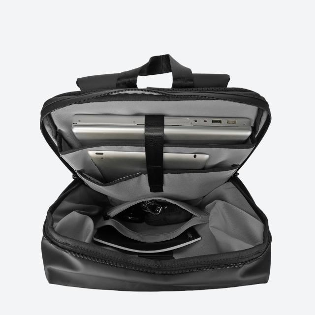 外装2カ所、内装4カ所、合計6カ所のポケットを搭載。PCスリーブは15インチまでのPCが収納可能です。荷物を整理整頓して、効率良く収納することができます。