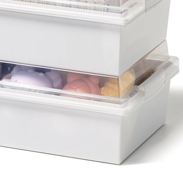 上部のフタが透明なので積み重ねても中身の確認ができ、棚などに並べていても見つけやすいです。フタには凹みを付けているので、重ねても滑り落ちにくく安心です。