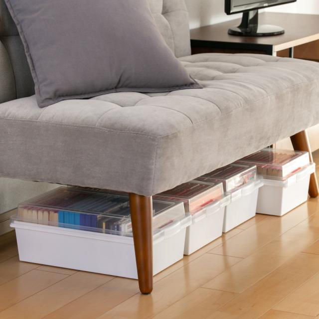 フタのロック部分に手を掛ければ出し入れもスムーズにできるので、ソファ下やベッド下スペースの活用にぴったりです。ベッド下は埃が被りやすいですが、フタ付きなので安心です。