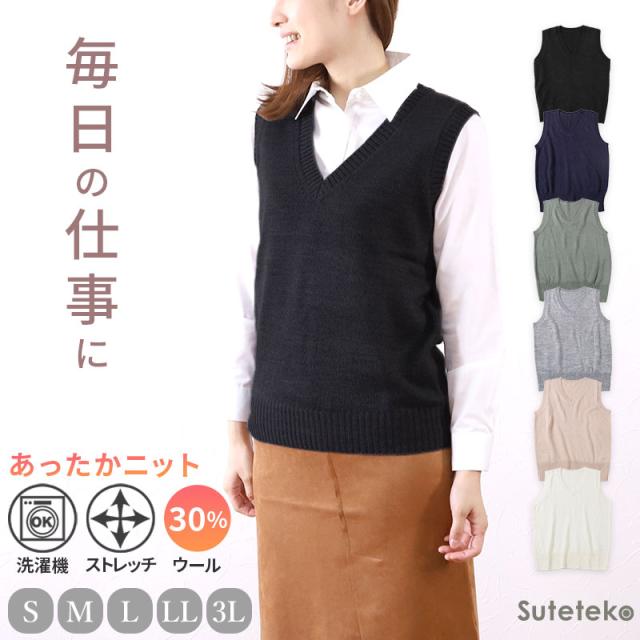 オフィス ベスト vネック ニット 洗える レディース ジレ チョッキ セーター スーツ 無地 シンプル S M L LL 3L Vネック V首 ウール 秋冬 洗濯機 仕事 制服 ビジネス ブレザー シンプル 黒 紺 グレー 白 大きいサイズ 30代 40代 防寒 秋 冬 暖かい