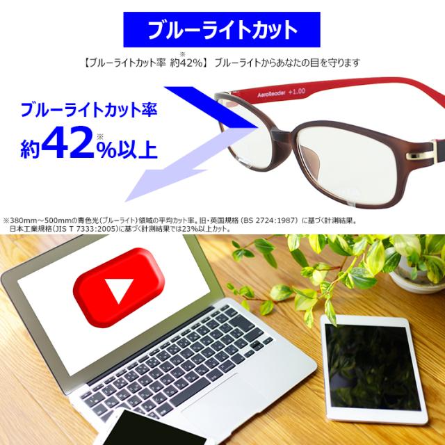 | リーディンググラス AeroReader エアロリーダー GR17 フィット感抜群!! 長時間掛けていても疲れにくいスリム老眼鏡。 どんな時でも使いやすい、機能的でソフトな使用感。 ◇PCレンズ ブルーライトカットレンズ 目に有害とされるブルーライトを約42%以上カットするレンズを使用。 (旧・英国規格BS2724:1987に基づく測定結果) ※日本工業規格に基づく測定結果では約23%以上カット。 ◇軽量フレーム 超弾性樹脂の採用で薄型が可能になり、強度と軽量化に成功しました。 ◇ジャパンフィット 日本人の顔幅や鼻にフィットする設計のため、快適な掛け心地です。 度数:+1.00、+1.50、+2.00、+2.50、+3.00、+3.50の6度数をご用意。 | |