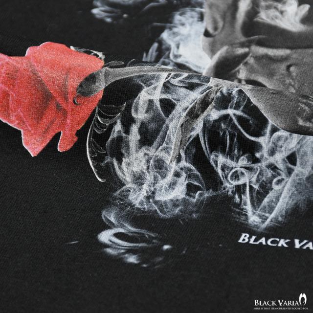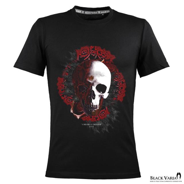メール便可/1枚まで Tシャツ 半袖 クルーネック ドクロ 薔薇 バラ 孔雀 フェザー 丸首 メンズ スリム 細身 mens(ブラック黒) crzkh230