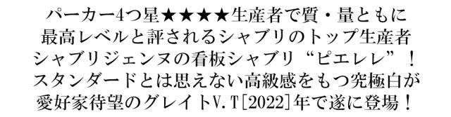 パーカー4つ星★★★★生産者で質・量ともに最高レベルと評されるシャブリのトップ生産者シャブリジェンヌの看板シャブリ“ピエレレ”!スタンダードとは思えない高級感をもつ究極白が愛好家待望のグレイトV.T[2022]年で遂に登場!