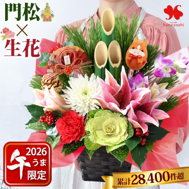 正月 花 アレンジメント お正月 門松風 豪華 アレンジ 2種類から選べる 翔馬 または 華駿 正月飾り お正月飾り 門松 午年 干支のピック付 正月花 フラワーアレンジメント 送料無料 玄関 生花 おしゃれ お正月アレンジメント モダン 2026 生花アレンジ ユリ 葉牡丹
