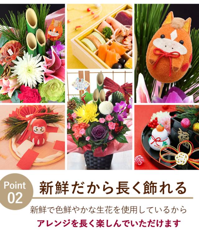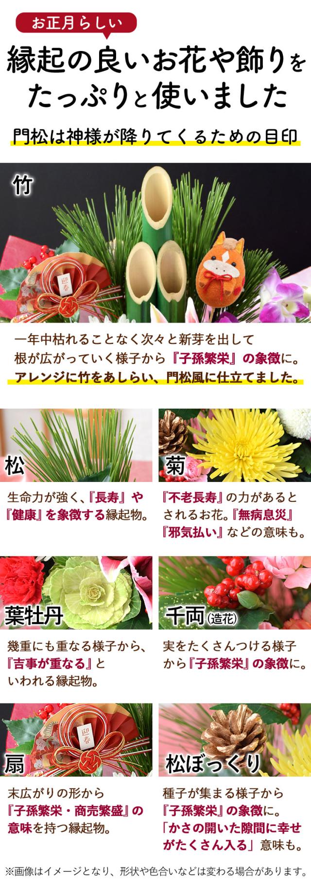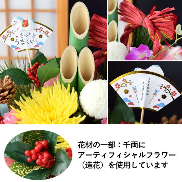 松/青竹/百合/アナスタシア/カーネーション/デンファレ/葉牡丹/千両(造花)/松ぼっくり/グリーン/干支ピック/扇ピック(デザインはおまかせ下さい)/